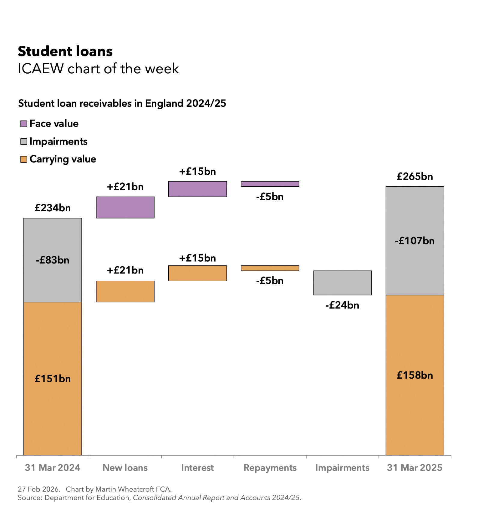 According to the Department for Education’s consolidated annual report and accounts 2024/25, the face value of student loans in England increased from £234bn to £265bn during the year ended 31 March 2025. The movements comprised £21bn in new loans advanced to students during the year and £15bn of added interest less £5bn in repayments.