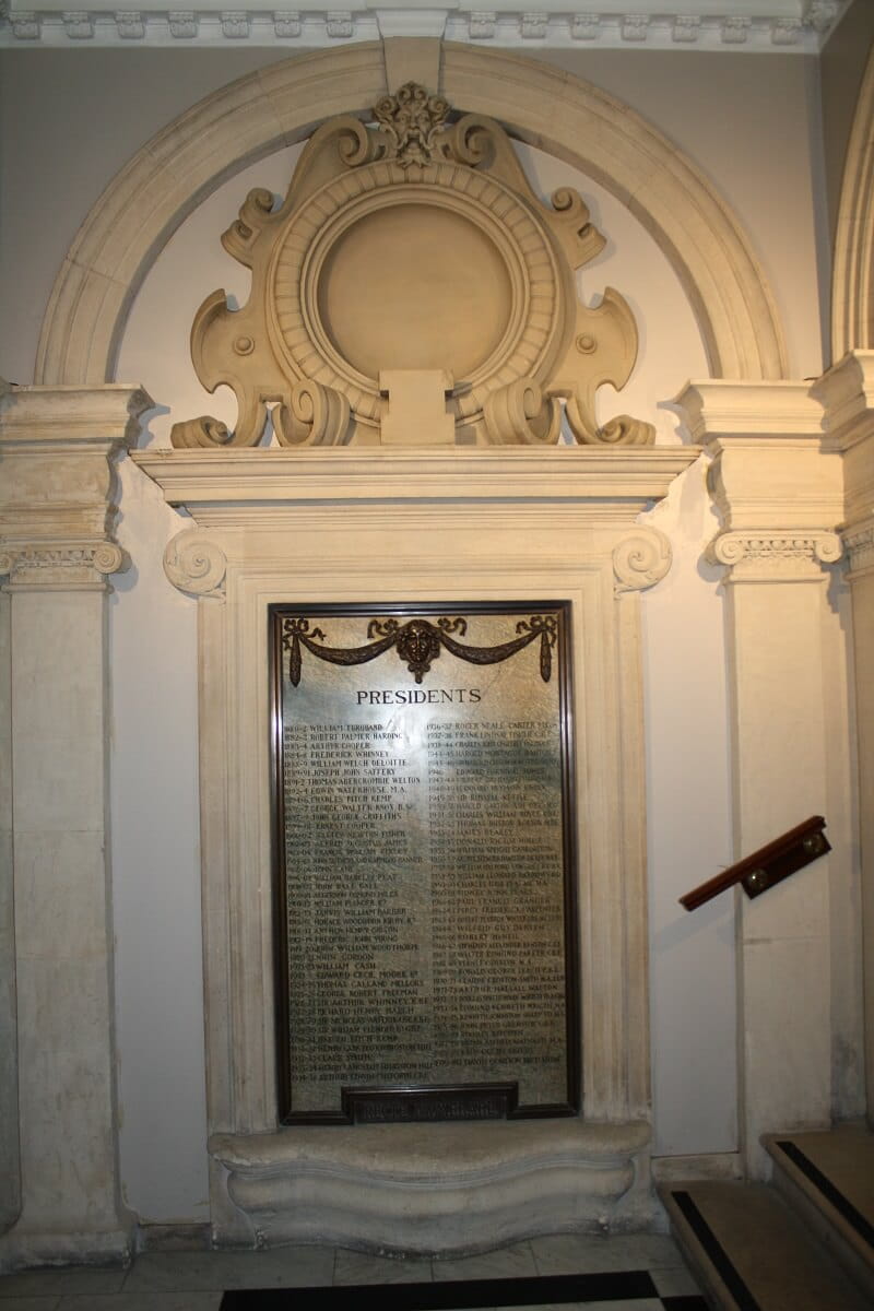John Belcher's grand hallway design features a pilastered entrance hall, with a coffered panelled ceiling inspired by the sixteenth century Italian architect Alessi's ornate Palazzo Cambiaso in Genoa. As part of the 1970s refurbishment programme, the previously white ceiling had its details highlighted with blue, red, white, gold and grey paint. It incorporates the letters 'ICA' (to stand for 'Institute of Chartered Accountants') repeatedly in its pattern.