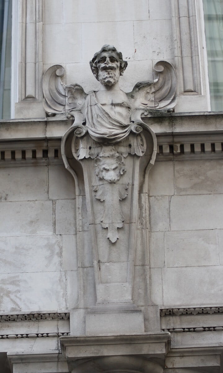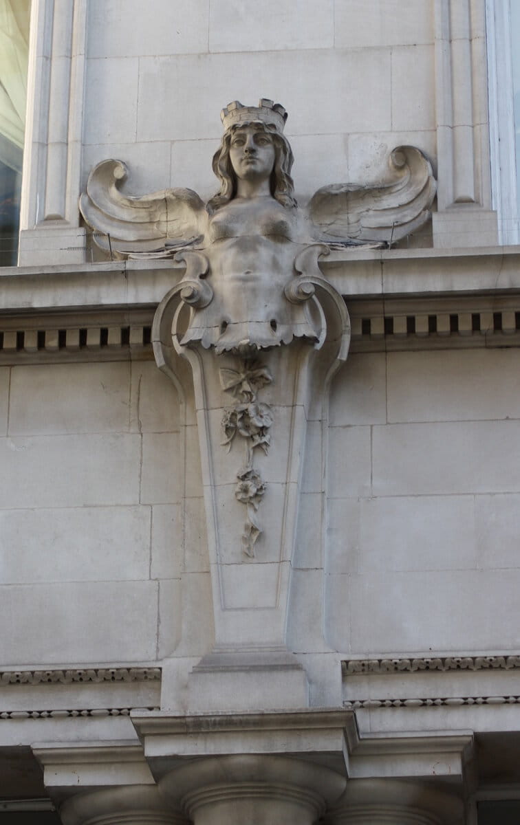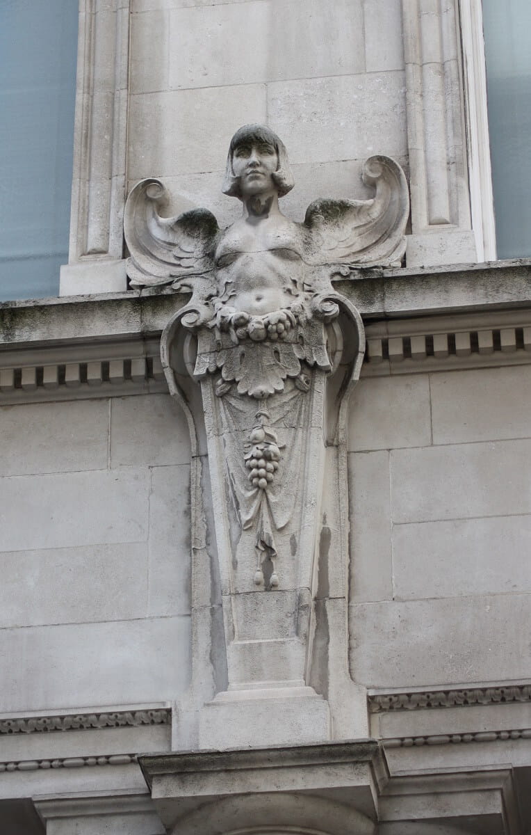 One of the many striking features of the exterior decoration of Chartered Accountants’ Hall are the angels that line the Moorgate Place and Great Swan Alley facades. These are a particular delight to visitors, especially those who note the way the 1930s extension by Belcher’s partner, John James Joass, continues the run of original angels with hairstyles appropriate to the 1920s-30s. More angels were added in the 1960s-70s.
