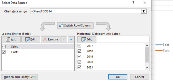 The legend enables the coloured lines and bars to be interpreted. Add the Element as explained above. The order that the components appear in the legend is the same as the order when they were defined. To change this order right click any one of the lines or bars on the Chart and chose Select Data. By using the up and down arrows at the top of the left-hand box will change the order of the items and the legend.