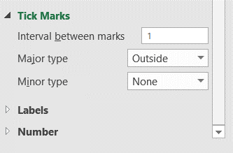 These are found under Axis Options and the number of them will automatically fit your data (like Axis Bounds explained in Blog 4). It will select 10 points rounded to whole numbers to create the vertical scale and use each item on the horizontal axis until there are greater than 10 at which point it is best to start simplifying the number of points. Using the Units Major on the vertical axis the interval between points can be manually selected and increased or reduced in detail.