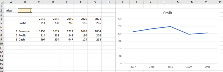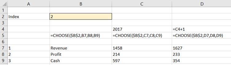 In the example above if the index in B6 is 2 then the value of the CHOOSE function in B8 will go to the third part of the formula and get the value in F4 which is 126.