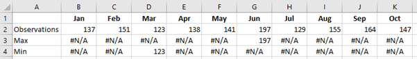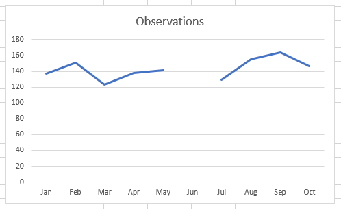 When analysing data there can be some instances of missing values. These can be entered as zeros or left blank. Unless controlled appropriately they can give rise to false impressions being created. Take for example the following series of observation data where the number for June is missing.