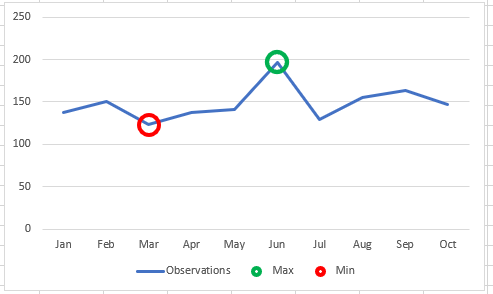 On a chart it may be helpful to highlight attributes such as a peak or trough. This can be done manually, but if data is changing it is much more effective to automate these highlights. Take the example below that highlights the Maximum and Minimum of the line.