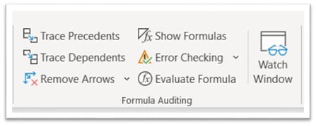 The Formula Auditing Group can be found on the Formulas ribbon. It has a range of helpful functions to validate details within the spreadsheet, especially when resolving errors.