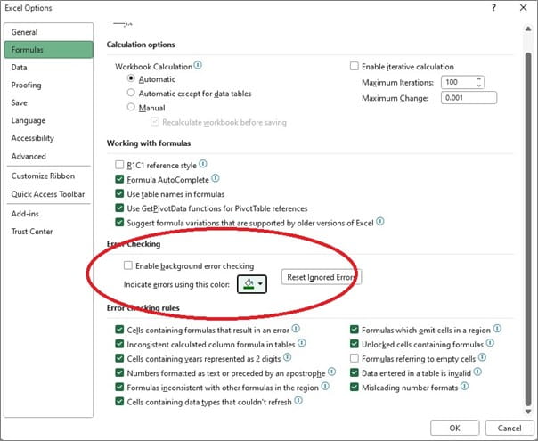 Excel is constantly checking for errors and will highlight these for you. Under Excel Options (found by selecting the File Ribbon and Options at the bottom of the left column), in the Formulas area you will see Error checking. If you select ‘Enable background error checking’ then Excel will place a small green triangle (or any other colour you choose) in the top left corner of every cell it considers may contain an error. In the block below you can select which errors you would like it to capture.