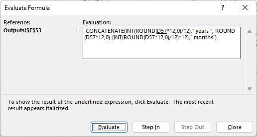 This function will calculate each component of a formula step by step. On each click of the ‘Evaluate’ button it will perform one calculation and then simplify the formula to display the answer and remove the function used to derive the value. However, the formula in the selected cell is left untouched, it is only in this function that it is dismantled.