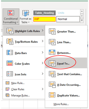 To colour the inner region of the chart we will use conditional formatting. First, we select all the inner regions of the chart and select Conditional Formatting -> Highlight Cells Rules -> ‘Equal To…’: