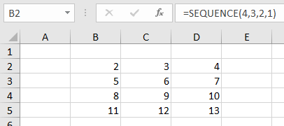 2. The SEQUENCE(rows, [columns], [start], [step]) function has one required (rows) and three optional arguments. This is one of the new dynamic array functions and fills rows number of rows, columns number of columns (1 if not specified), starting at start (1 if not specified) in increments of step (1 if not specified). Hence, =SEQUENCE(4,3,2,1) would be