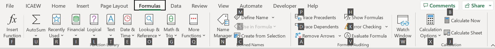 For example, to navigate to the Formulas tab you can use Alt + M which will take you to the Formulas ribbon. From there, you can see the Key Tips which can be used to move around the Formula ribbon.