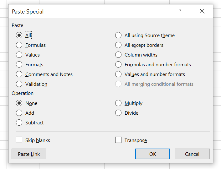 However, there may be instances where you only need to copy and paste the values. You can do this in Excel Online easily by using Ctrl + Shift + V to paste the values of the cells only. While this shortcut won’t work in desktop versions, you can work around this by using Ctrl + Alt + V to open the Paste Special dialogue box. From here, you can select ‘Values’.