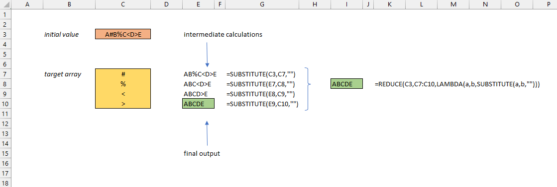 The final example (before we dig into the syntax of the REDUCE function) considers text instead of numbers. Here we are looking to clean (i.e., remove) the characters in the target array from the initial value by repeated application of the SUBSTITUTE function: