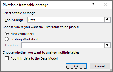 Slicers retain the underlying data formatting (using the $ currency symbol and displaying to two [2] decimal places) in this instance. However, let’s imagine we wanted to create a Power Pivot report instead. In this case, we need to add the data to Excel’s Data Model – the “filing cabinet” where all data used for Power Pivot is stored. We would repeat the above process with one lyrical deviation. When we get to the ‘PivotTable from table or range’ dialog box we require one seemingly minor adjustment: