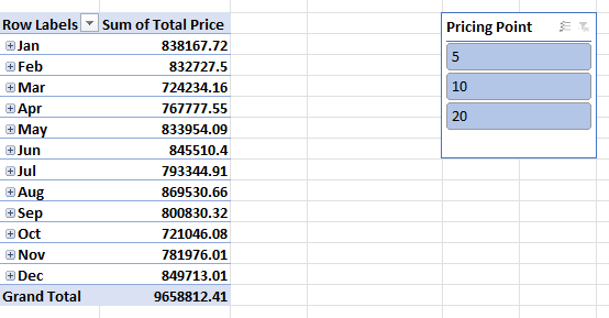 Accepting that Best Practice would be to change the header names and format the values, let’s ignore these points as this is not what this article is about! Instead, ensuring that we select a cell within the PivotTable once more from the context specific tab “PivotTable Analyze’ (again, in green), let’s select ‘Insert Slicer’ from the ‘Filter’ grouping (the user-friendly keyboard shortcut ALT + JT + SF). Let’s select ‘Pricing Point’: