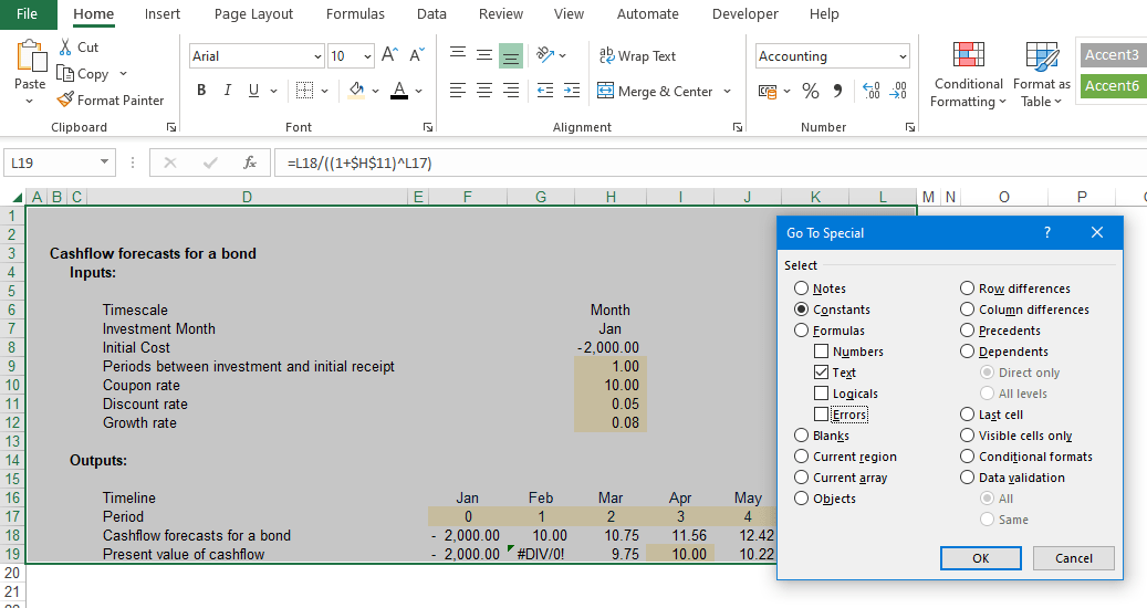 Result – The final result is a much clearer indication what each cell actually is. In this case it has shown that some of the labels are actually formulas (cells D7:D8) and that some of the cells which looked like formulas are actually hard coded constant inputs (cells K18 and H19).