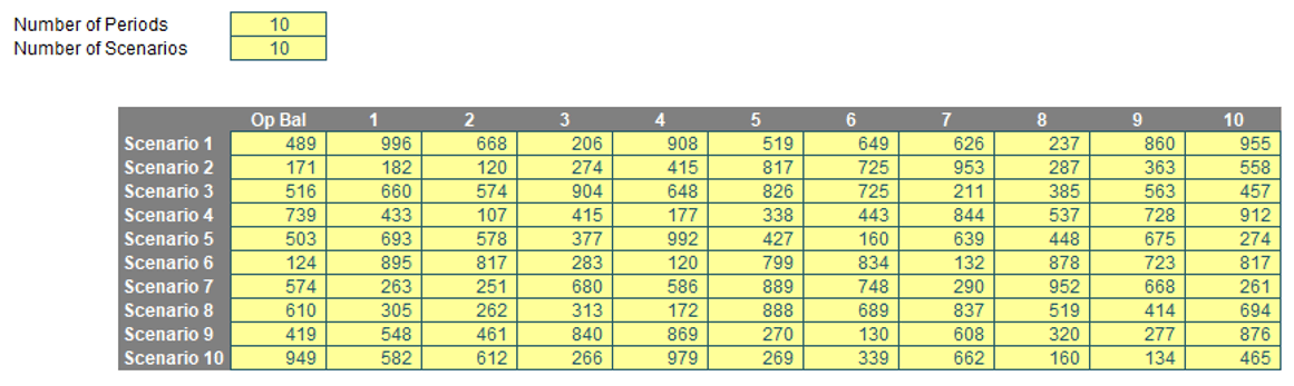 This has been set up so that the number of periods (given the range name Periods) and the number of scenarios (given the range name Scenarios) may vary between one [1] and 10, eg,