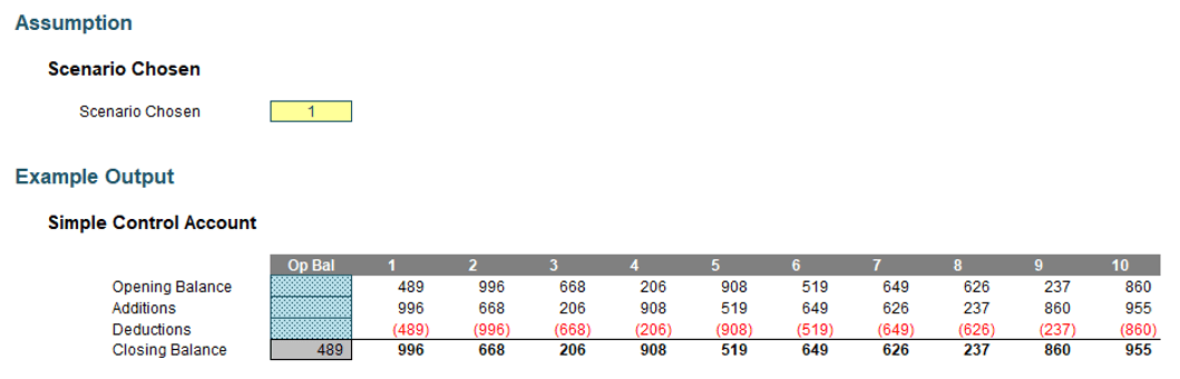 To illustrate my idea, I am going to create a Control Account of this data, assuming the first column represents the opening balances, and the remaining columns state the purchases (say) for the particular scenario and period. Therefore, for Scenario 1, I might have a Control Account that looks like this: