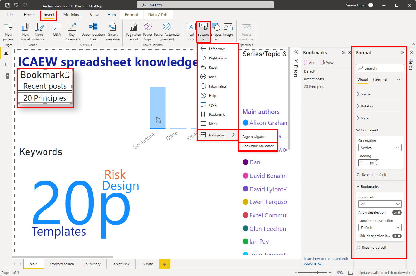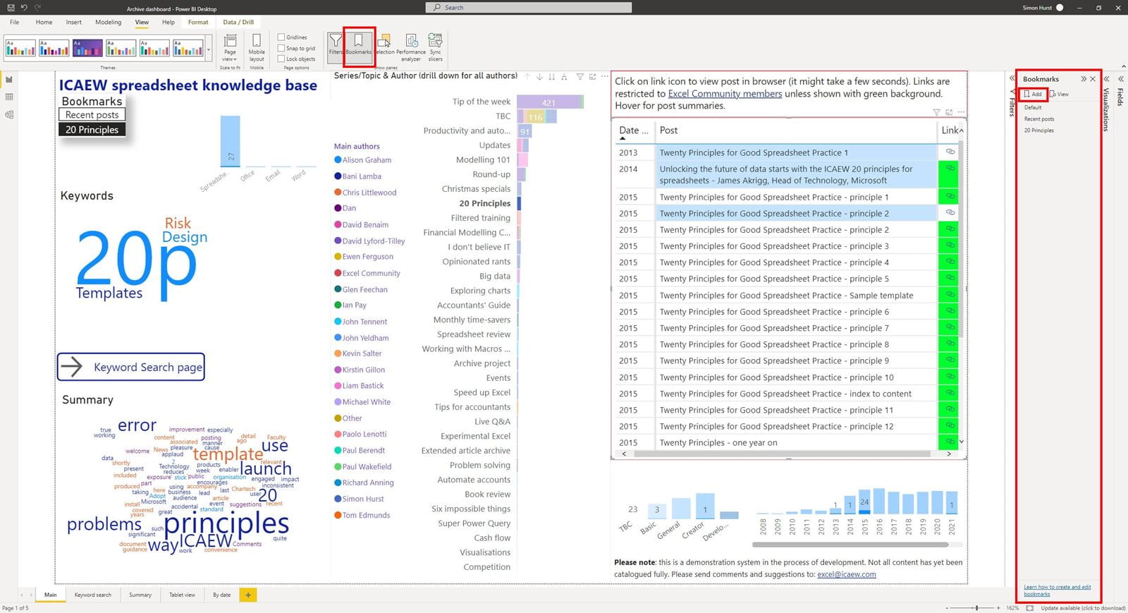 Since the Excel Community dismantled its paywall, membership has increased more than tenfold. As part of ensuring that thousands of new members are aware of the key projects the community is responsible for, we are running a series of articles looking at each of the four spreadsheet publications launched over the past 10 years. Each of these projects is supported by series of explanatory articles that form part of the community archive. These articles are tagged accordingly in the archive. In order to facilitate access to the list of relevant articles for each project, we have added bookmarks to our Power BI archive portal, so that the list can be displayed with a single click.
