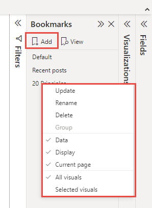 For example, here we have inserted a Bookmark navigator and used the Grid Layout section of the Format, Visual pane to choose to display the buttons vertically and with reduced padding. This helps us to create a relatively compact block of buttons to select each of our bookmarks. We have also created a ‘Default’ bookmark by adding a bookmark when our report page has no filters set and with the list of articles sorted in reverse chronological order. In the Bookmark section of the Format, Visual pane we can turn on ‘Allow deselection’ and set this Default bookmark as the bookmark to be ‘launched’ when all the other bookmarks are deselected. This gives us an easy way to go back to our normal display of the report page: