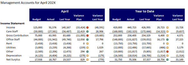 Column order – someone asked whether the first column in the management accounts should be budget or actual. I don’t think there is a right or wrong here. I usually start with budget as this was the original plan set by the board before the year began, it aligns to the medium term plan and therefore the management accounts is primarily reporting – ‘are we on track’.