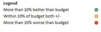 Variance – this is calculated by taking Actual – Budget thus positives are good news and negatives are bad news.