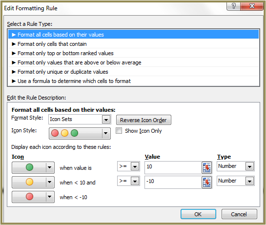 You will also notice in the middle of the dialog box there is check box for ‘Show Icon Only’. This will replace the variance number with a traffic light rather than displaying both in the cell. This can be helpful in reducing the number of columns displayed to avoid shrinking the report to enable it to fit on a single page.