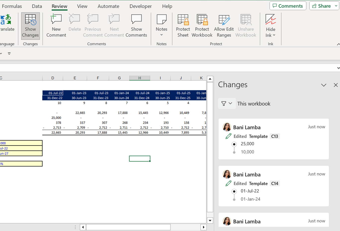 To enable this functionality, you need to save your document in either SharePoint or OneDrive. In the Review tab click on ‘Show Changes’ to see a pane open up on the right-hand side with a list of all the edits made to cells in the spreadsheet.