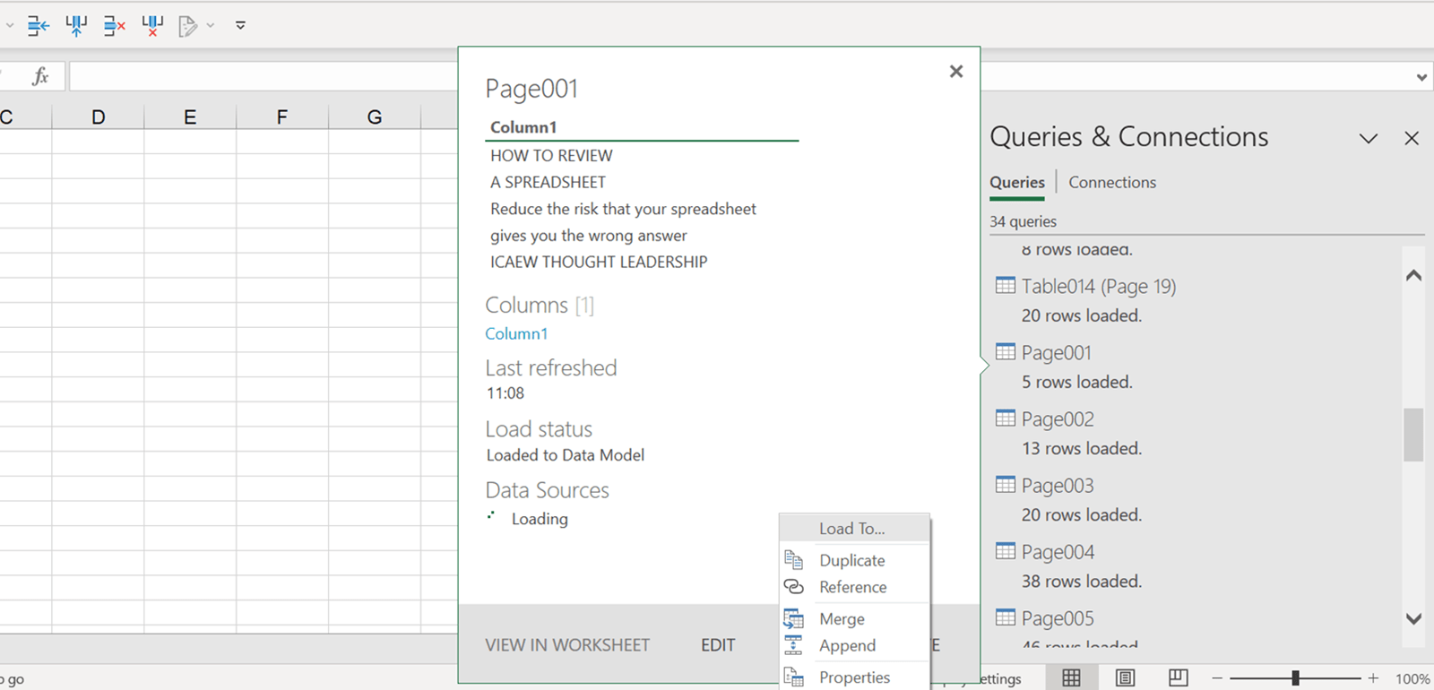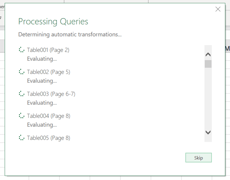When importing data from several pages of a PDF, Excel wants to create a tab for each page - how do I import several pdf pages to one Excel tab?Answer