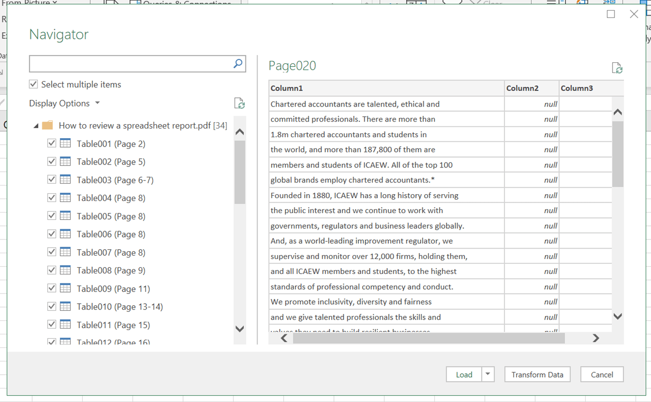 There is a workaround for this which you can use to get data from a PDF into one Excel tab.In the Data tab click on ‘Get Data’ and then ‘From File’ and ‘From PDF’ to get started. Select the PDF and then all the pages you want to load into Excel.