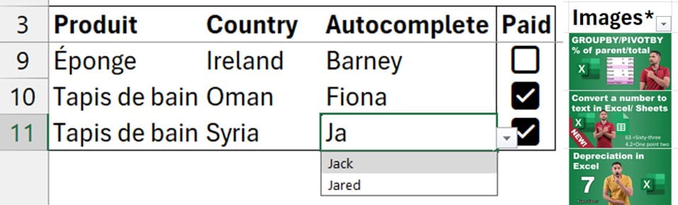- Autocomplete dropdown lists: Click Data tab > Data validation > List and select the range with the dropdown as you did previously, but now it autocompletes as you type.