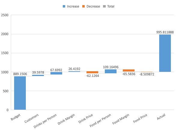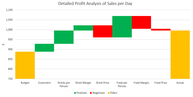 The following data is used for our example – it is a pub restaurant showing the causal factors to explain the reason for a profit achievement above budget. When designing these charts, it is helpful to limit the number of columns to around 10. More than this and the detail detracts from the clarity of message (ie, focus on the main reasons for difference). In limiting the number of columns, it may be tempting to group all the smaller values into one single column called ‘Other’. Be careful this ‘Other’ column does not become the largest reason for difference and thus need an explanation of its components.