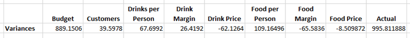 To calculate the variance caused by customers consuming more drinks than budget, start with the actual Customers and multiply it by actual Drinks per person and the budget values for the remaining items. (258 x 1.6 X 41% X 3.2)+(258 X 0.5 X 43% X 8.2) = 996.44. The difference caused by a change in the number of Drinks per person is therefore £996.44 - £928.75 = £67.69.