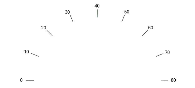 To enable the dial to be read more easily it can be helpful to put a calibration scale around. This is easily achieved although a little fiddly to do so. Essentially it is another half doughnut with a set of narrow segments to provide the markings. In our example we want the dial to go up to £80 million so if we want to start at 0 we will need nine marks for each £10 million and also 8 gaps.