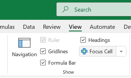 If you haven’t seen it already, you’ll find focus cell in the ‘View’ tab of the ribbon in your workbook. Alternatively, you can use Alt + W + E + F to access this using a keyboard shortcut.