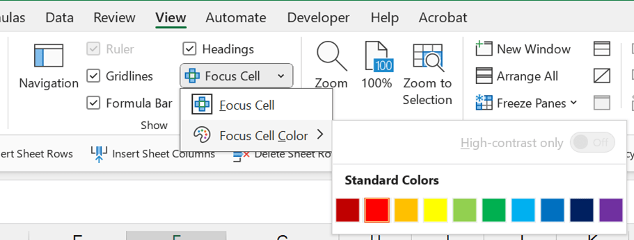 The drop-down in the focus cell menu also allows you to change the focus cell colour, which may be useful to adapt it to the existing formatting of the sheet.