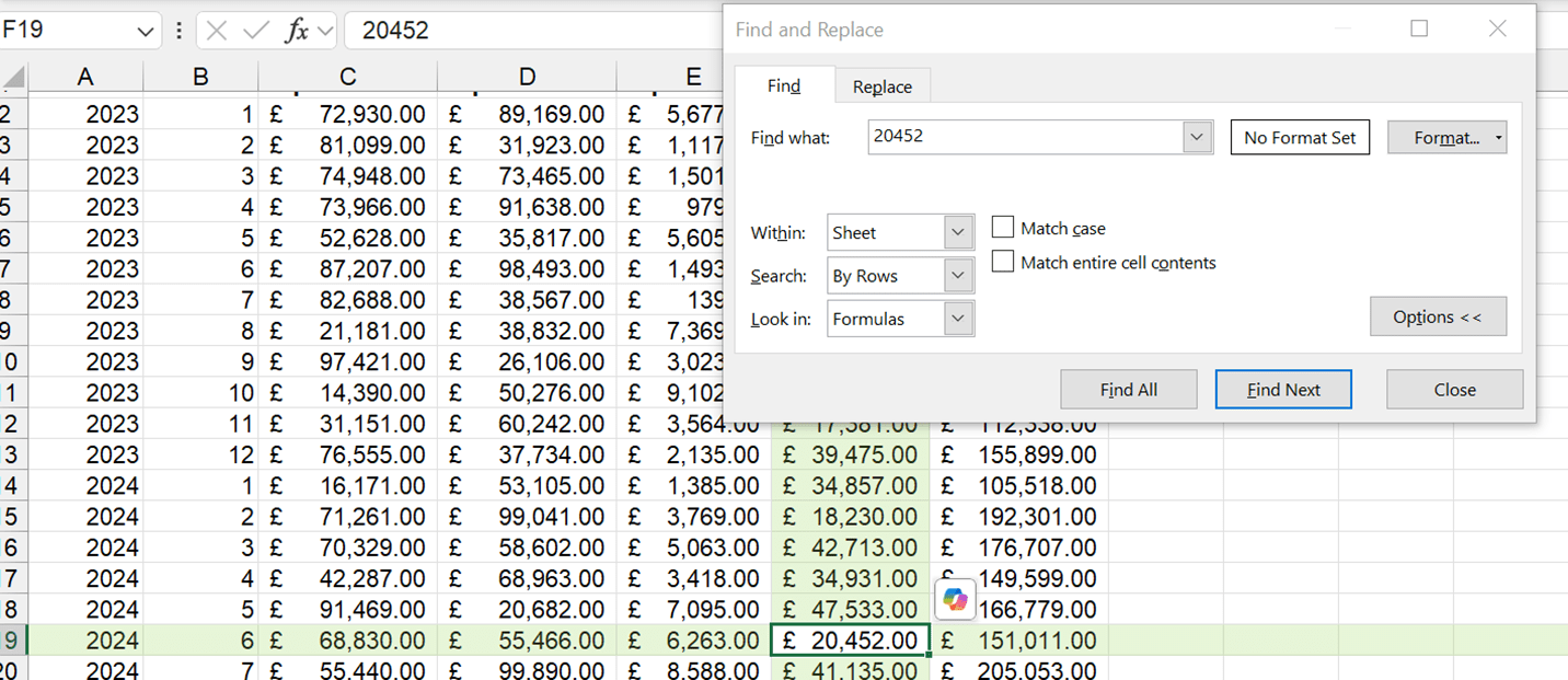 Focus cell also works with Find and Replace in Excel, making it easier to search for and locate multiple values in a large workbook as you move across cells.