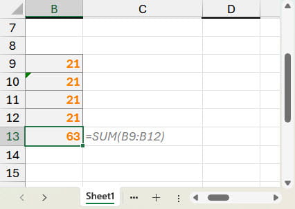 The last article’s investigation of incomplete cell ranges started with 4 cells, each containing the value 21, seeming to add up to 42. This time, our 4 cells seem to add up to 63: