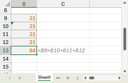 Just before we replace our text 21 with a proper number, we will create our total using a different formula. Rather than using SUM() we will just add our four cells using the plus operator: