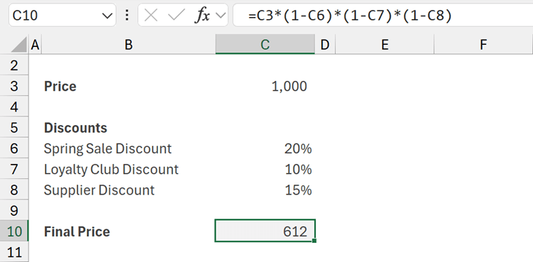 Using standard words, the calculation we want to perform is for each discount is:Take the previous result and multiply it by one minus the current discount.
