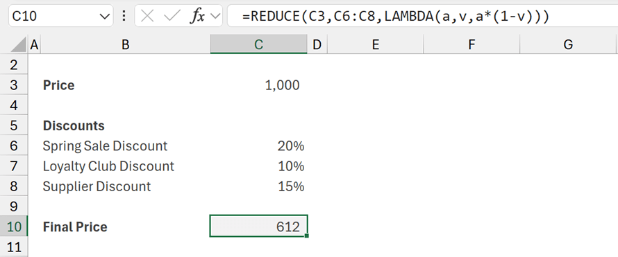 =REDUCE(C3,C6:C8,LAMBDA(a,v,a*(1-v)))