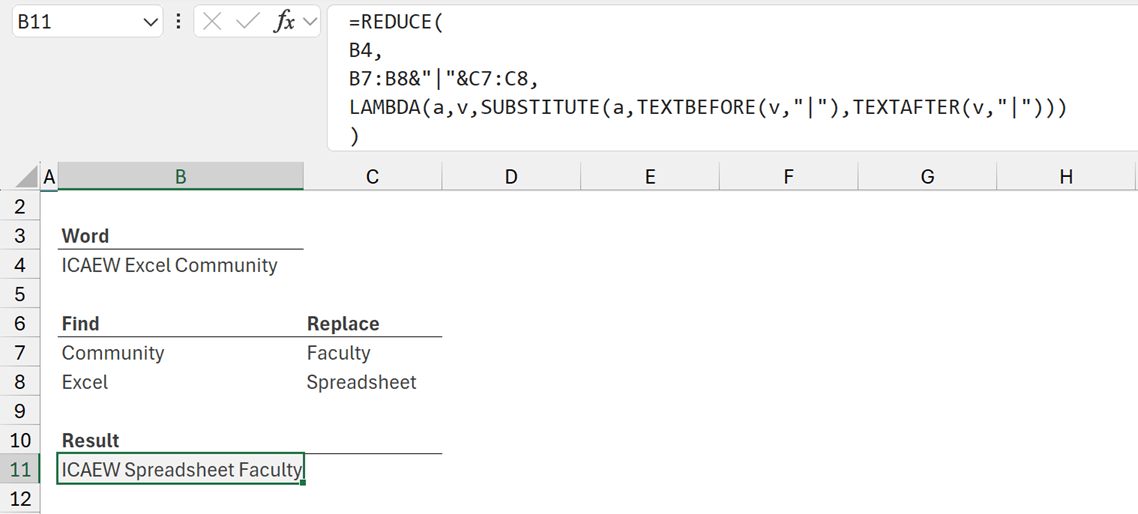 - B7:B8&"|"&C7:C8 joins the find list and replace list into a single array with the values separated by the | symbol. (eg, Community|Faculty and Excel|Spreadsheet).
