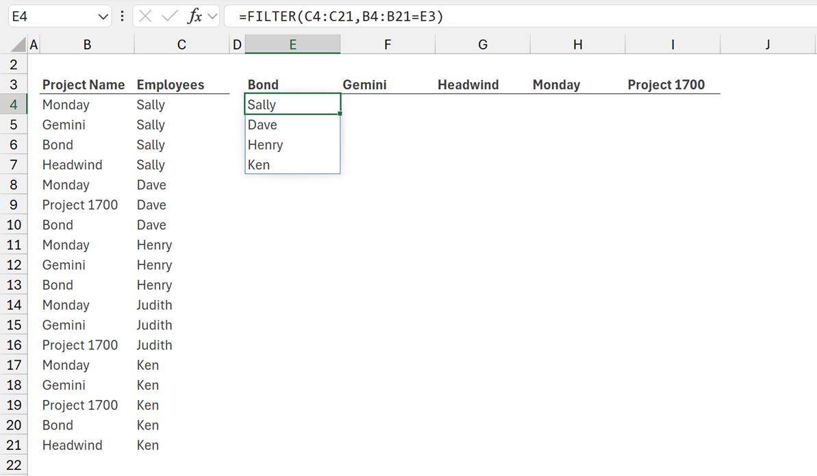 Since E3 is dynamic, we might think we could change E3 to E3# and all the values would populate. However, doing this returns the #VALUE! error. The reason for this are beyond the scope of this post. But let’s just say that FILTER doesn’t work like that.