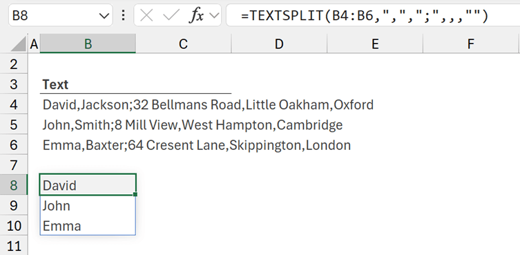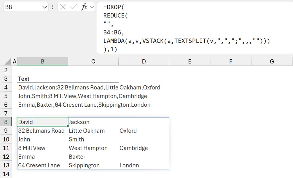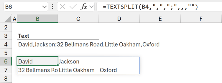 This splits the text in B4, using a comma ( "," ) to separate columns, a semicolon ( ";" )to separate rows, and any missing values are padded with empty text stings ( "" ).