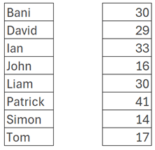 Ranges have visible presence on the worksheet. Therefore, we can see the values of "Bani", "David", "Ian", "John", "Liam", "Patrick", "Simon" and "Tom" are all included within the lookup_array argument. Also, 30, 29, 33, 16, 30, 41, 14 and 17 are included in the return_array argument.