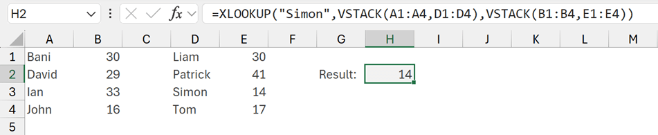 =XLOOKUP("Simon",VSTACK(A1:A4,D1:D4),VSTACK(B1:B4,E1:E4))